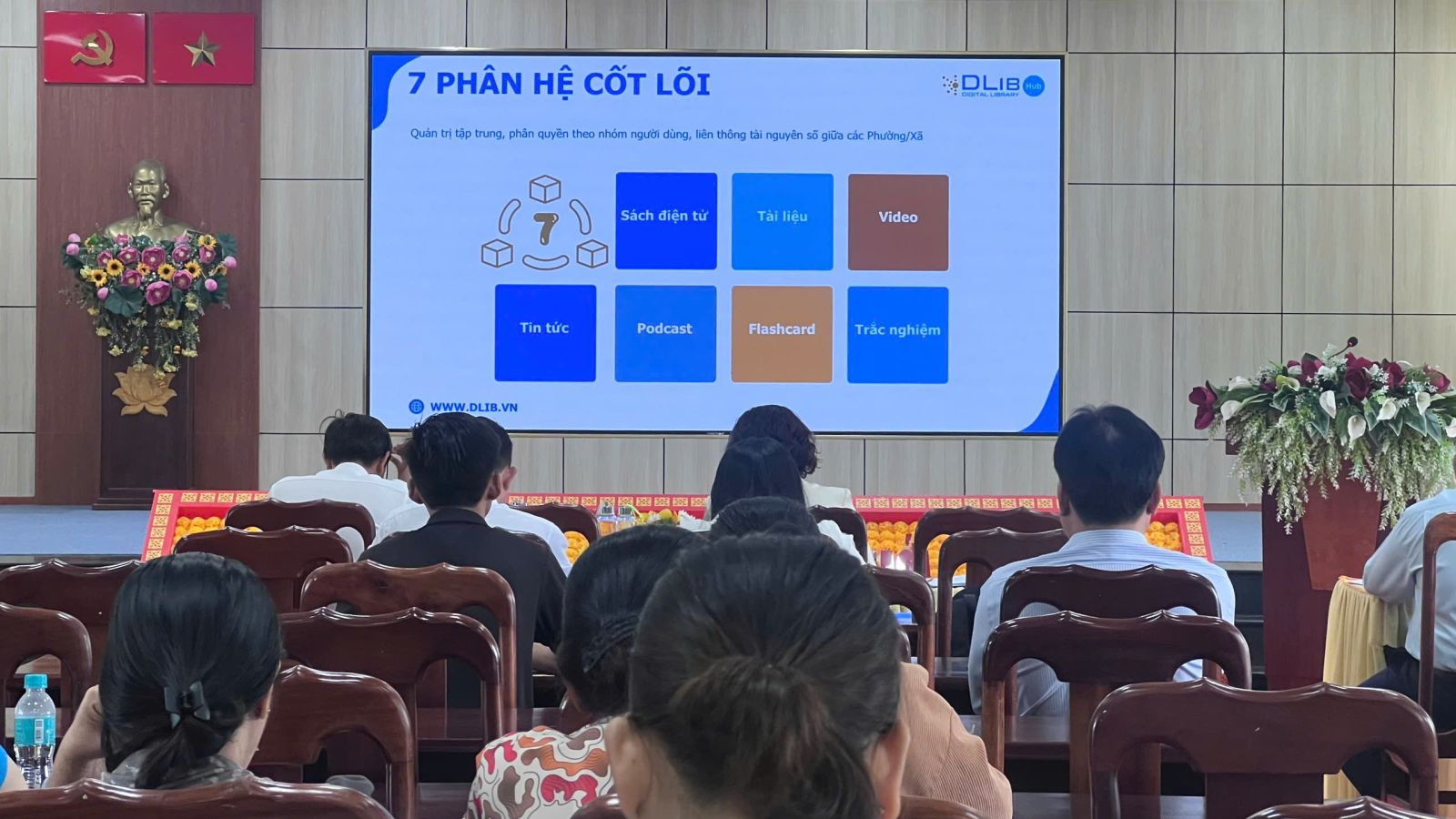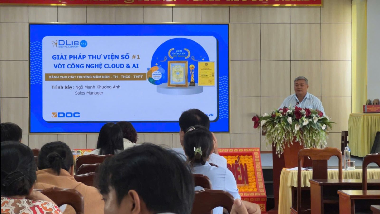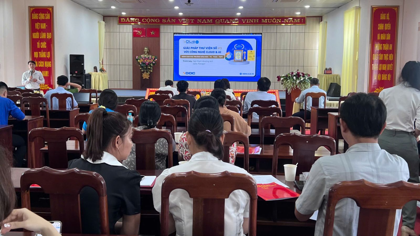Tiếp nối chương trình, ông Ngô Mạnh Khương Anh – đại diện Công ty VDOC đã trình bày chi tiết về hai nền tảng Thư viện số DLib K12 và Thư viện số DLib Hub. Ông giới thiệu các tính năng nổi bật của hệ thống, bao gồm kho học liệu điện tử, sách số, video, podcast, flashcard và các công cụ học tập trực tuyến. Thư viện số DLib không chỉ phục vụ cho nhà trường mà còn hướng tới người dân, cán bộ, học sinh – bất kỳ ai có nhu cầu học tập và tra cứu tri thức. Với nền tảng công nghệ Cloud và AI, hệ thống cho phép quản lý tài nguyên tập trung, liên thông dữ liệu giữa các đơn vị. Giải pháp này mở ra hướng tiếp cận tri thức nhanh chóng, hiện đại và tiết kiệm thời gian.